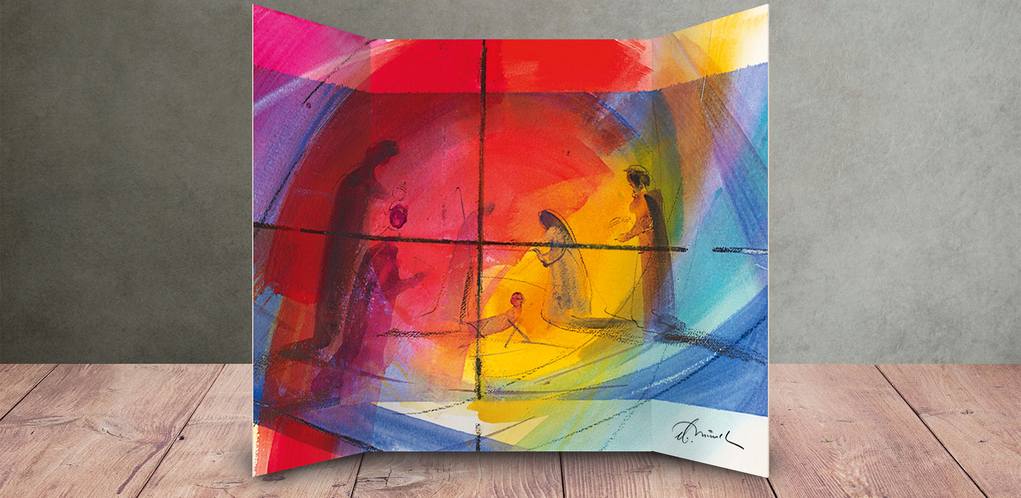 Am Anfang sehe ich Farben. Alle Schattierungen des Regenbogens sind vorhanden. Das kräftige Rot dominiert und wird vom Blau, Grün und Gelb umrahmt. Wie ein Zelt wölben sich die Farbflächen und schwingen. Wenn ich möchte, sehe ich in den flächigen Strukturen ein Auge. Oder ist eine Art Höhle angedeutet? Langsam nehme ich die Figuren wahr. Einige sind klar und deutlich, die beiden Gestalten links wirken fast so, als sei nur ihr Schatten zu sehen. Alle nehmen eine sich beugende, kniende Haltung ein. Ja, sie beten an. Nur flüchtig skizziert sind die Gaben, die drei von ihnen in der Hand halten. Eine Person kniet ganz nah und beugt sich zur Krippe.